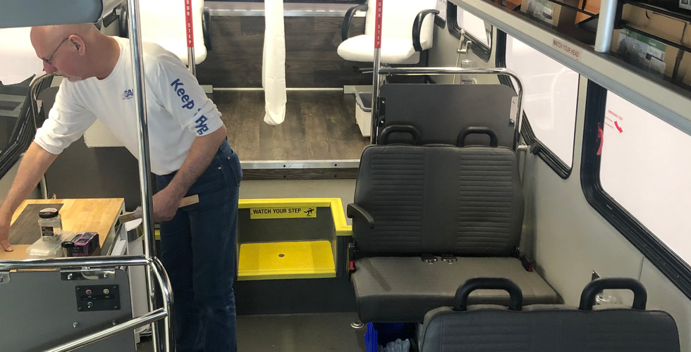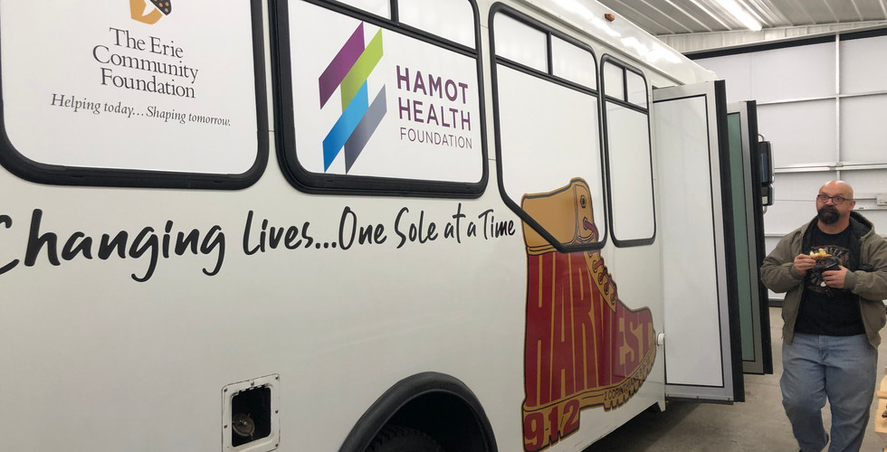 of our partners at Hamot Health Foundation and The Erie Community Foundation. Purchasing the bus was just the beginning and it has been a HUGE project. Once the bus arrived in Erie, our friends Matt and Rick at MK Enterprises did the initial mechanical upgrades and fixed all the road safety issues, then we removed almost all of the old seating and wrapping the bus with graphics from Sharper Images. Now, we were ready to install all the systems and turn the bus into a clinic space where our guests would feel welcomed, have their feet washed, get a foot exam from one of our volunteer Docs, and then leave with a new pair of boots and other necessities. Little did we know what an undertaking the refit would be! Thankfully, Rick and Mike came to the rescue - they ingeniously engineered and installed all of the water tanks, propane, water heater, plumbing, and electrical components, fitting everything into very tight spaces and making sure that everything worked just the way it was supposed to. Mike then got to work doing a gorgeous finishing job and final product is just amazing!! Check out the photo of the project from start to finish...